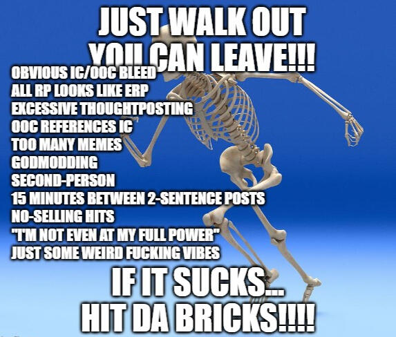 • IC/OOC bleed. I am not my character. Disrespecting these boundaries is a zero-tolerance offense.